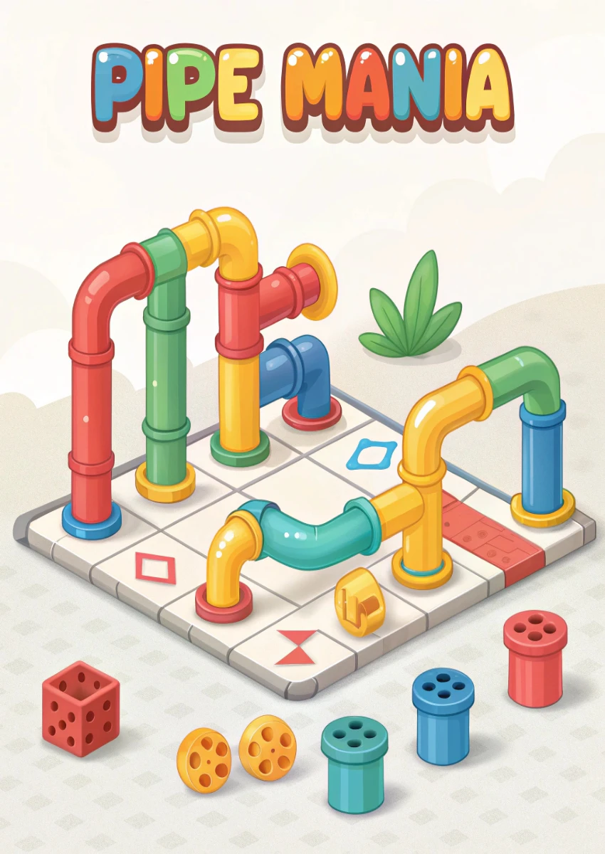 Pipe Mania is a classic tile-placing puzzle game where your goal is to build a continuous pipeline and guide the flowing liquid (often called “flooz”) from start to finish before it spills. You must think fast and act quickly, rotating and placing random pipe pieces to form a connected route while racing against the timer. With increasing difficulty, limited space, and random pieces, every level becomes a test of speed, planning, and spatial logic.